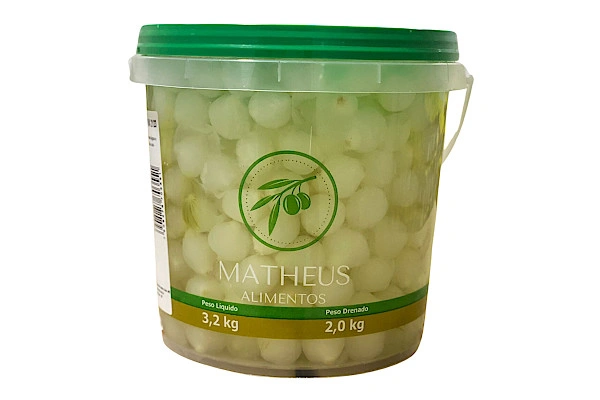 Cebolas descascadas prateadas, água, sal, ácido acético, regulador de acidez, ácido cítrico e conservador benzoato de sódio.